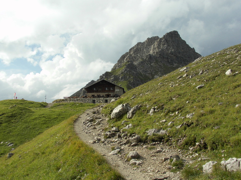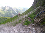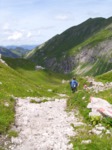 Ab dem Oberen Mädelejoch geht es über den Wanderweg 438, begleitet von einer Steinbockherde, stets leicht bergab. Die Kemptner Hütte, unser Tagesziel