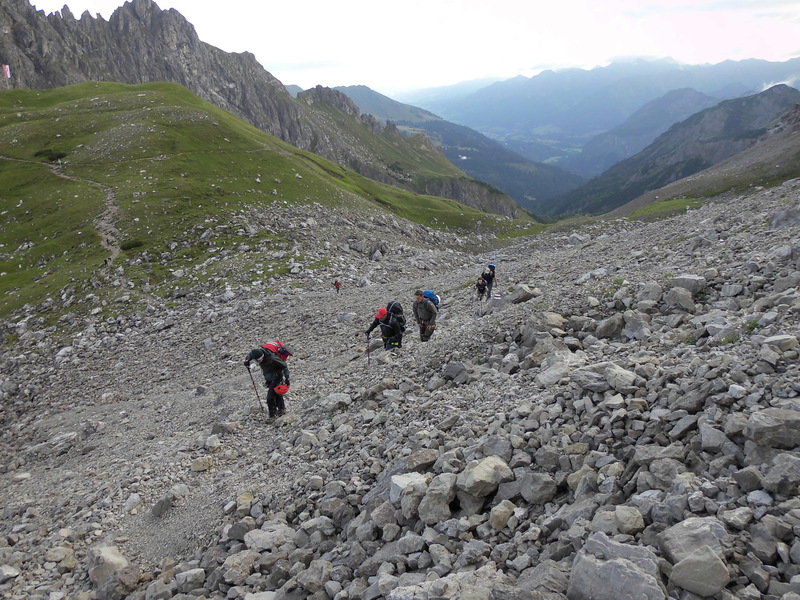 In den Fels geht es auf der zweiten Etappe. Von der Fiderepaßhütte geht es zunächst durch Geröll hinauf zur Fiderescharte auf 2.210 m. Den freien Blick über alle Gipfel genießen wir vom