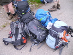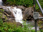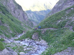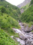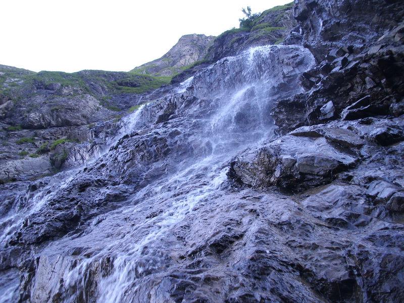 Wasserfälle begleiten uns. Vorbei an letzten Altschneefeldern, durch üppige Vegetation. Leider ist der Weg durch die nächtlichen Regenschauer mitunter sehr rutschig.