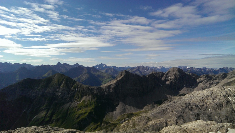 Bockkarscharte auf 2.504 m. Lohnenswert! Die Blicke möchten sich dort kaum von den Gipfeln, die wie Zuckerschaumspitzen vor uns liegen, lösen.