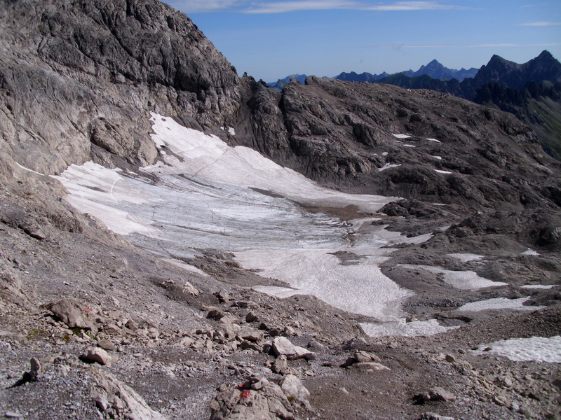 Wir folgen dem Heibronner Weg (432) weiter und erreichen den Schwarzmilzferner, den letzten Gletscher der Allgäuer Alpen. Der Klimawandel ist hier nur