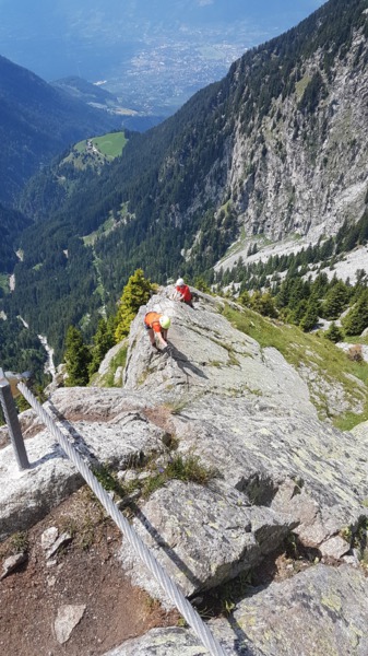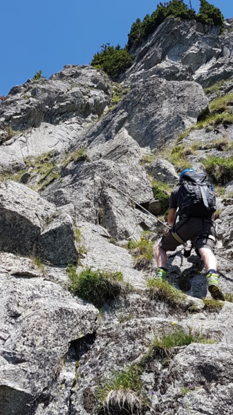 Der Klettersteig führt nun über mehrere Abschnitte hinuaf auf den Gipfel. Passagen, die einige Konzentration erfordern, wechseln sich mit seilversicherten Steigen ab.